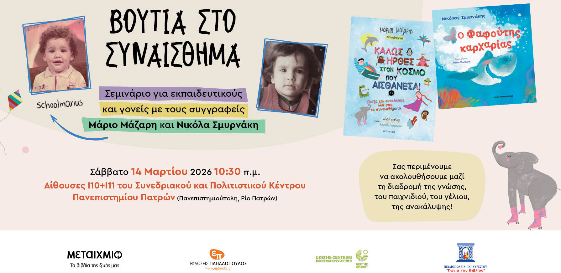 Το Goethe-Zentrum Patras, το βιβλιοπωλείο ΓΩΝΙΑ ΤΟΥ ΒΙΒΛΙΟΥ, οι εκδόσεις ΠΑΠΑΔΟΠΟΥΛΟΣ και οι εκδόσεις ΜΕΤΑΙΧΜΙΟ σε προσκαλούν σε ένα διαφορετικό σεμινάριο που θα πραγματοποιηθεί από τους συγγραφείς Μάριο Μάζαρη και Νικόλα Σμυρνάκη το Σάββατο 14 Μαρτίου 2026, στις 10:30 π.μ.,
